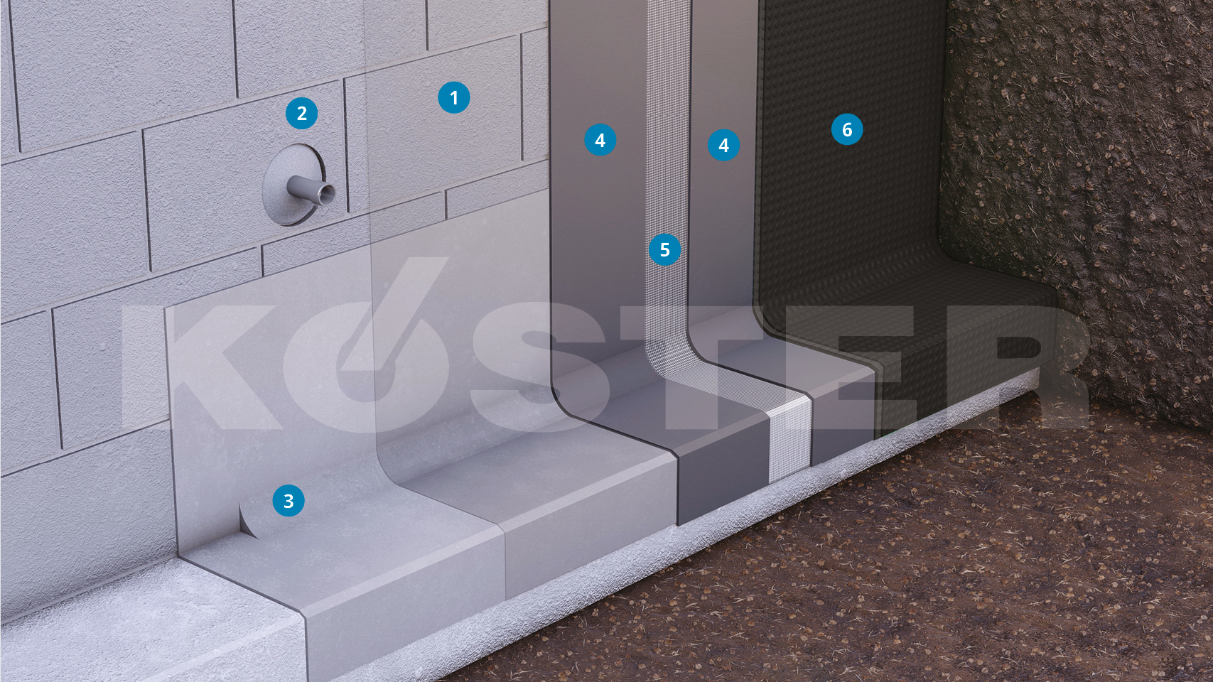 De kelderafdichting aan de buitenzijde wordt standaard met Köster NB Elastic Grijs of Köster NB Elastic Wit in twee afdichtende lagen opgebracht. Aanbevolen wordt Köster Flex weefseldoek in te bedden, tussen de twee lagen om zo een bijzonder taaie elastische afdichtslaag te maken.