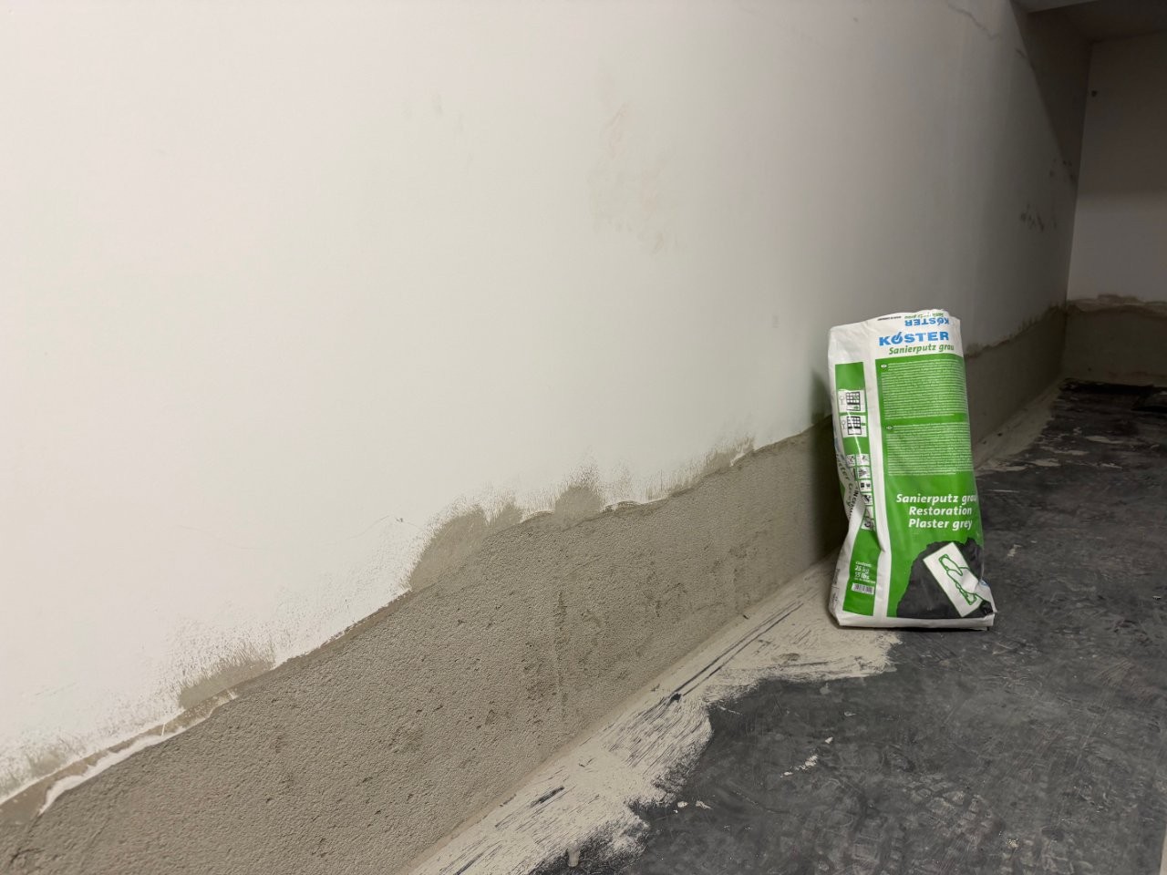 Uszczelnienie dylatacji oraz rampy wjazdowej w garażu podziemnym w technice iniekcji ciśnieniowej żelem akrylowym KOSTER S4. Przepona poziona w ścianach wewnętrznych kremem iniekcyjnym KOSTER Crisin Creme. Tynki renowacyjne KOSTER Sanierputz na zawilgoconych ścianach.