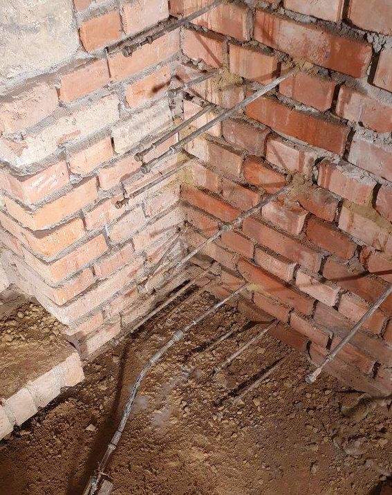 Wykonano iniekcję kurtynową przeciekających ścian i sklepień ceglanych. Do iniekcji użyty został poliuretanowy żel KOSTER PUR Gel. Materiał był rozcieńczany wodą w proporcjach 1:6 do 1:10.